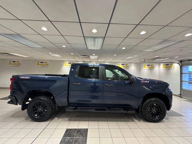 Northsky Blue Metallic 2021 Chevrolet Silverado 1500 Custom Trail Boss 2021 Chevrolet Silverado 1500 4D Crew Cab Custom Trail Boss EcoTec3 5.3L V8 6-Speed Automatic Electronic with Overdrive 4WD Non-Smoker, Lane Keep Assist, Rear Camera, 6-Speed Automatic Electronic with Overdrive, 4WD, Northsky Blue Metallic, 12 Speakers, 3.42 Rear Axle Ratio, 4-Wheel Disc Brakes, 40/20/40 Front Split Bench Seat, ABS brakes, Air Conditioning, Alloy wheels, AM/FM radio: SiriusXM, Apple CarPlay/Android Auto, Auxiliary External Transmission Oil Cooler, Black Tailgate CHEVROLET Lettering (LPO), Brake assist, Cloth Seat Trim, Custom Convenience Package, Dark Essentials Package (LPO), Delay-off headlights, Driver door bin, Driver vanity mirror, Dual Exhaust w/Polished Outlets, Dual front impact airbags, Dual front side impact airbags, Electronic Stability Control, Front anti-roll bar, Front Center Armrest w/Storage, Front License Plate Kit, Front reading lights, Front wheel independent suspension, Fully automatic headlights, Heated door mirrors, Heavy-Duty Air Filter, Hill Descent Control, Hitch Guidance, Illuminated entry, Infotainment Package, Integrated Trailer Brake Controller, Low tire pressure warning, Occupant sensing airbag, Off-Road Suspension w/2" Lift, Outside temperature display, Overhead airbag, Overhead console, Panic alarm, Passenger door bin, Passenger vanity mirror, Polished Exhaust Tip, Power door mirrors, Power steering, Power windows, Preferred Equipment Group 2CX, Premium audio system: Chevrolet Infotainment 3, Radio data system, Radio: Chevrolet Infotainment 3 System, Rear reading lights, Rear step bumper, Rear window defroster, Remote keyless entry, Safety Confidence Package, Security system, Speed control, Speed-sensing steering, Split folding rear seat, Tachometer, Theft Deterrent System (Unauthorized Entry), Tilt steering wheel, Traction control, Trip computer, Variably intermittent wipers, Voltmeter, Wheels: 18" x 8.5" Black Painted Aluminum.